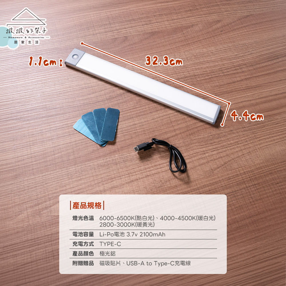 【撥撥的架子】32cm 三色磁吸LED感應燈 移動感應櫥壁燈 衣櫃照明燈 氛圍燈 人體感應燈 USB-C充電 亮度可調