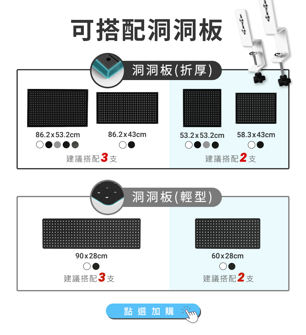 讓洞洞板垂直架設在桌側,不占桌面空間。