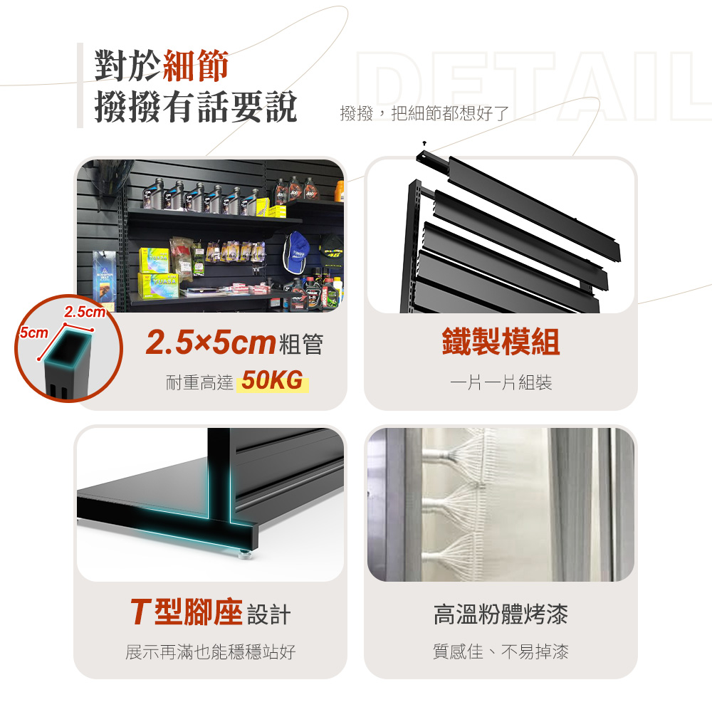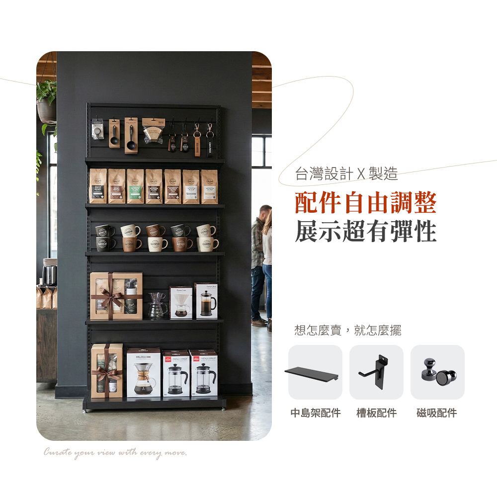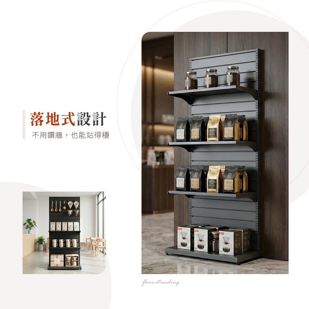 這款 生存遊戲溝槽板展示架,結合工業風鐵件結構 + 高承重溝槽板系統,
