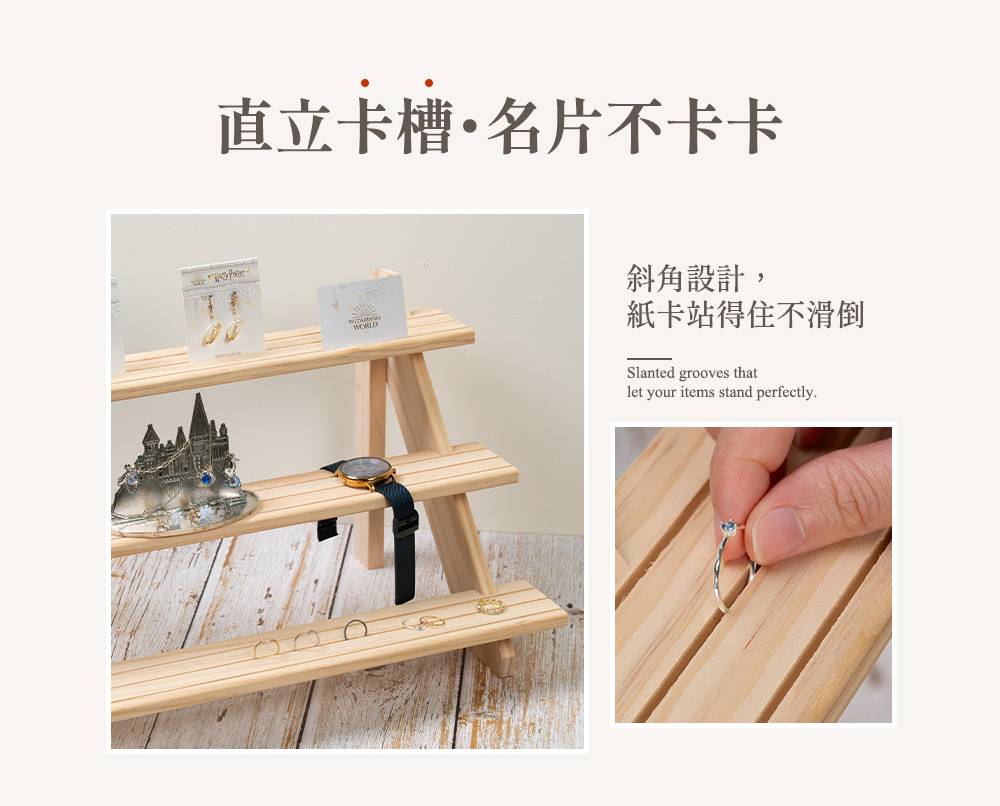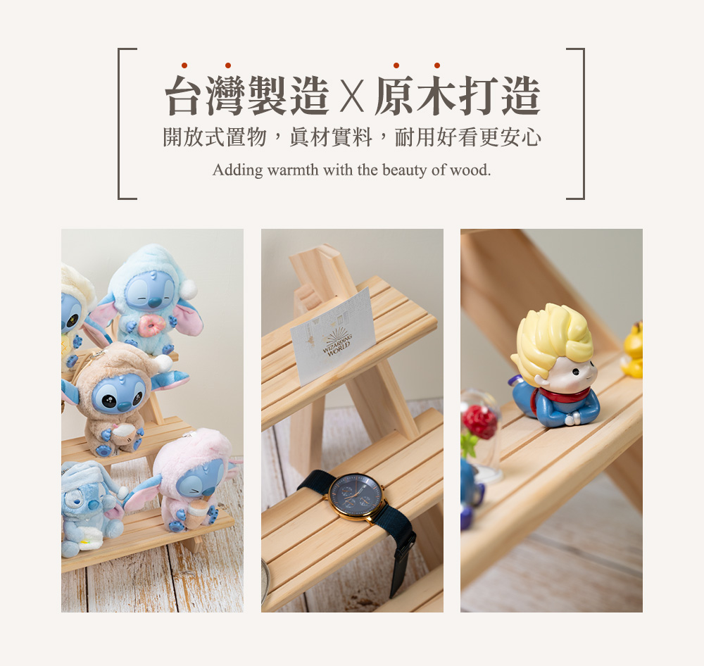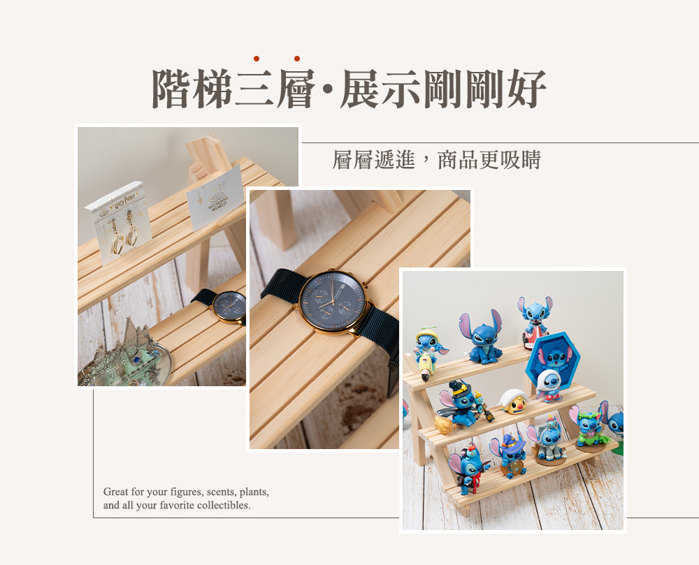 階梯式實木展示架,以溫潤原木勾勒層次之美,陳列更有故事感。